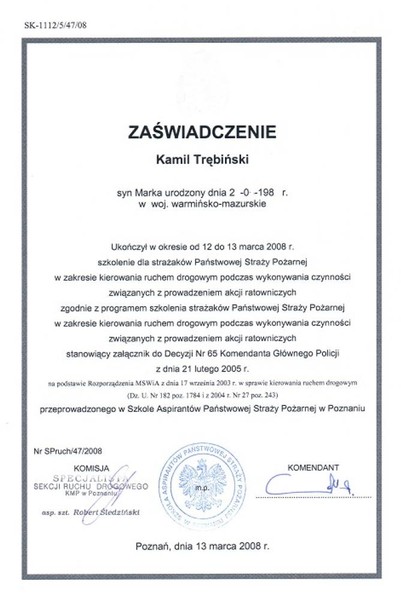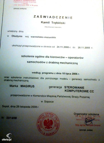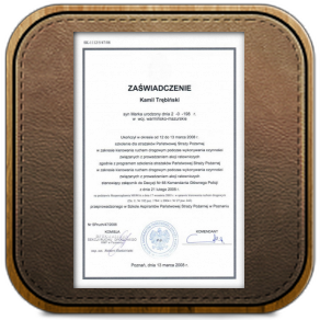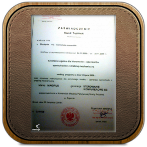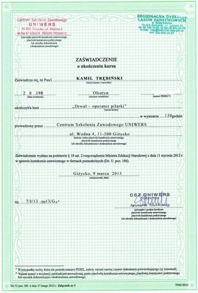 Certificate of completion of the course "Woodcutter-saw operator" after completion, which can cut the tree without limitation as to size.