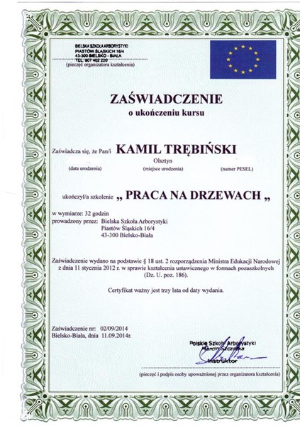 Certificate of completion of the course "Work on the trees".